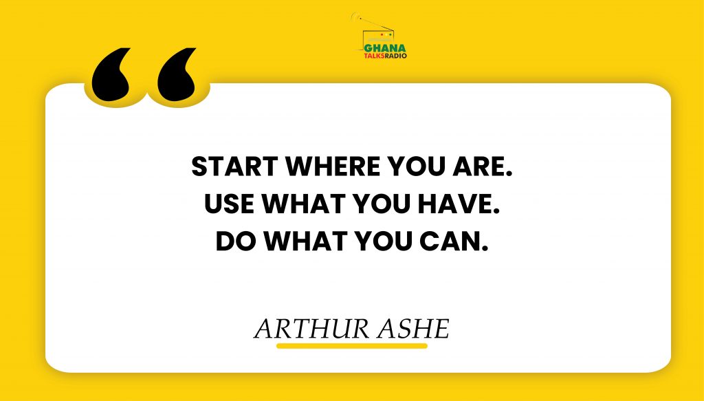 LifestyleInspirational Quotes Daily Inspirational Quote | GhanaTalksRadio.com | Jun 30 | 2023 30th June 2023 0 236 Share Facebook Twitter WhatsApp Linkedin Pinterest Telegram Viber START WHERE YOU ARE. USE WHAT YOU HAVE. DO WHAT YOU CAN. ~Arthur Ashe