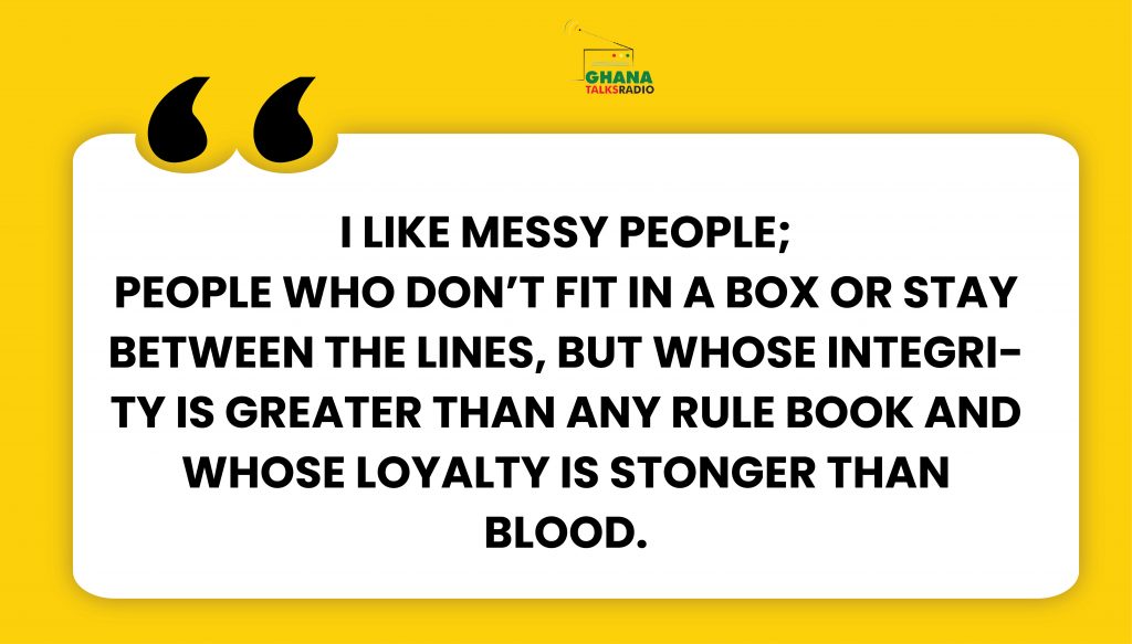 I LIKE MESSY PEOPLE; PEOPLE WHO DON’T FIT IN A BOX OR STAY BETWEEN THE LINES, BUT WHOSE INTEGRITY IS GREATER THAN ANY RULE BOOK AND WHOSE LOYALTY IS STONGER THAN BLOOD.
