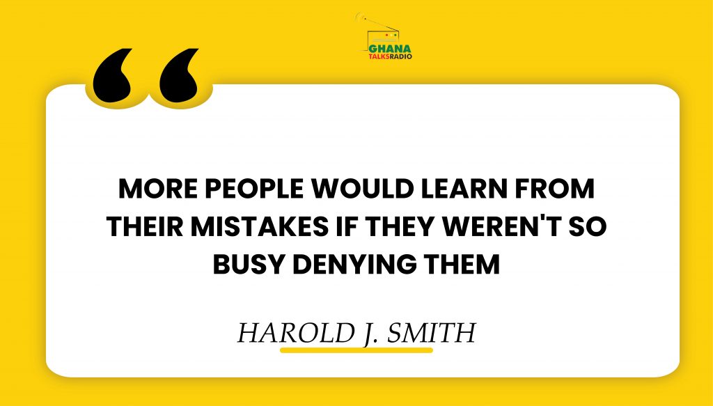 LifestyleInspirational Quotes Daily Inspirational Quote | GhanoaTalksRadio.com | Jun 10 | 2023 10th June 2023 0 245 Share Facebook Twitter WhatsApp Linkedin Pinterest Telegram Viber MORE PEOPLE WOULD LEARN FROM THEIR MISTAKES IF THEY WEREN’T SO BUSY DENYING THEM. ~HAROLD J. SMITH