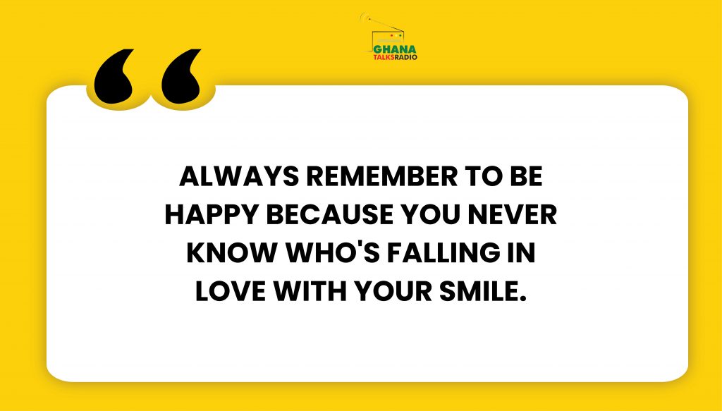 LifestyleInspirational Quotes Daily Inspirational Quote | GhanoaTalksRadio.com | May 25 | 2023 25th May 2023 0 290 Share Facebook Twitter WhatsApp Linkedin Pinterest Telegram Viber ALWAYS REMEMBER TO BE HAPPY BECAUSE YOU NEVER KNOW WHO’S FALLING IN LOVE WITH YOUR SMILE.