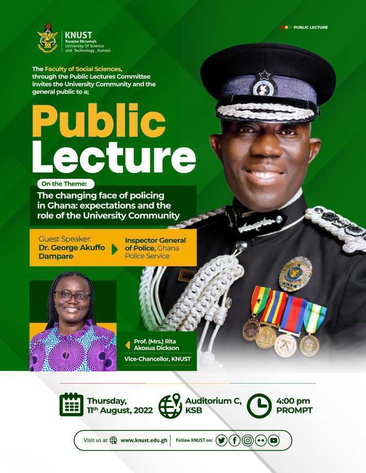 The Inspector-General of Police (IGP), Dr. George Akuffo Dampare will today, Thursday, August 11, 2022, deliver a lecture on policing at the Kwame Nkrumah University of Science and Technology (KNUST) in Kumasi.