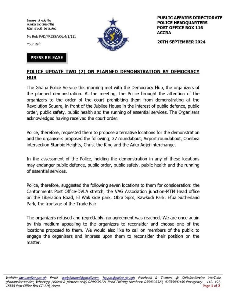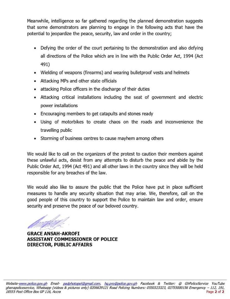 The Ghana Police Service has issued a stern warning to the organizers of the upcoming Occupy Jubilee House protest, cautioning that they will be held responsible for any violations of the Public Order Act if the demonstration goes ahead on Saturday, September 21, 2024.