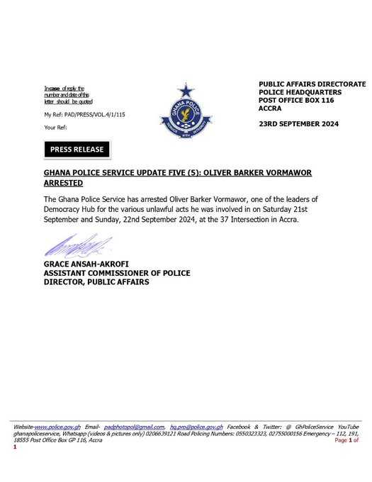 One of the leaders of the Democracy Hub protesters, Oliver Barker-Vormawor, has been arrested by the police.