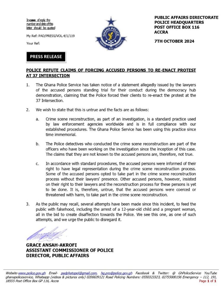 The Ghana Police Service has denied allegations from the lawyers of individuals involved in the Democracy Hub demonstration, asserting that their clients were coerced into re-enacting the protest at the 37 Intersection as part of the investigation.