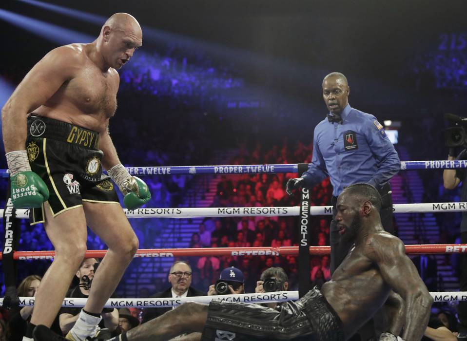 Tyson Fury, knocks down Deontay Wilder during a WBC heavyweight championship boxing match Saturday, Feb. 22, 2020, in Las Vegas.