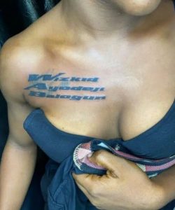 The young lady drew a tattoo of the singer’s full name “Wizkid Ayodeji Balogun,” boldly on her chest.