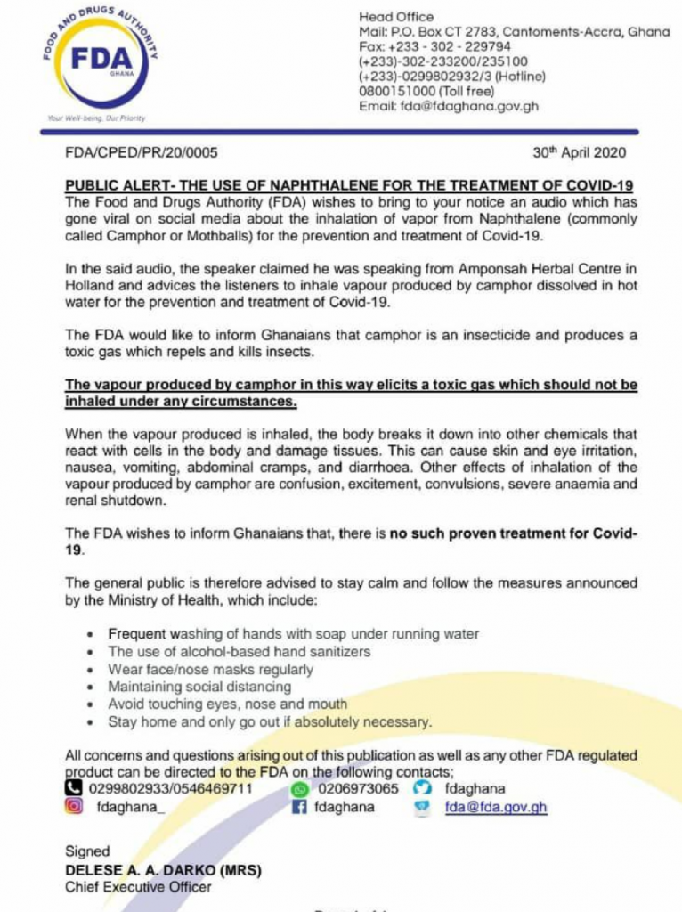 But contrary to claims, the Food and Drugs Authority has sounded a stern caution to Ghanaians against heeding to the advice from the purported audio.