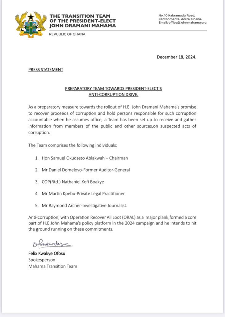 President-elect John Dramani Mahama has appointed a five-member team to lead the National Democratic Congress’ (NDC) preparations for the launch of its Operation Recover All Loot (ORAL).
