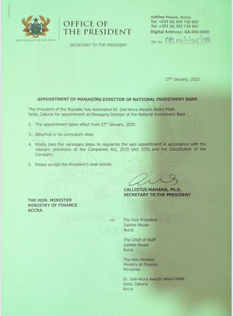 President John Dramani Mahama has appointed Dr. Doli-Wura Awushi Abdul-Malik Seidu Zakaria as the Managing Director of the National Investment Bank (NIB), effective January 27, 2025.