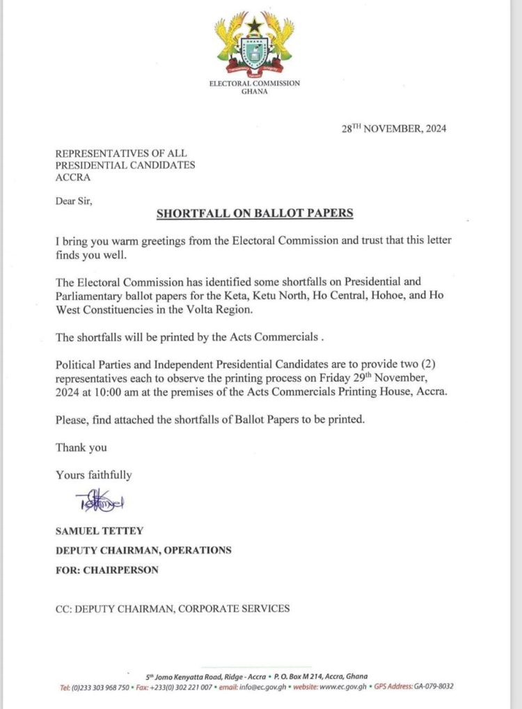 Political parties and independent candidates have been requested to send two representatives each to observe the printing process, which is set to take place on Friday, November 29, 2024, at 10:00 am in Accra.
