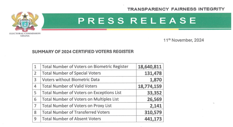 With just weeks remaining until the 2024 general elections on December 7, the Electoral Commission (EC) has revealed the certified voter register, confirming that 18,774,159 Ghanaians are eligible to vote.