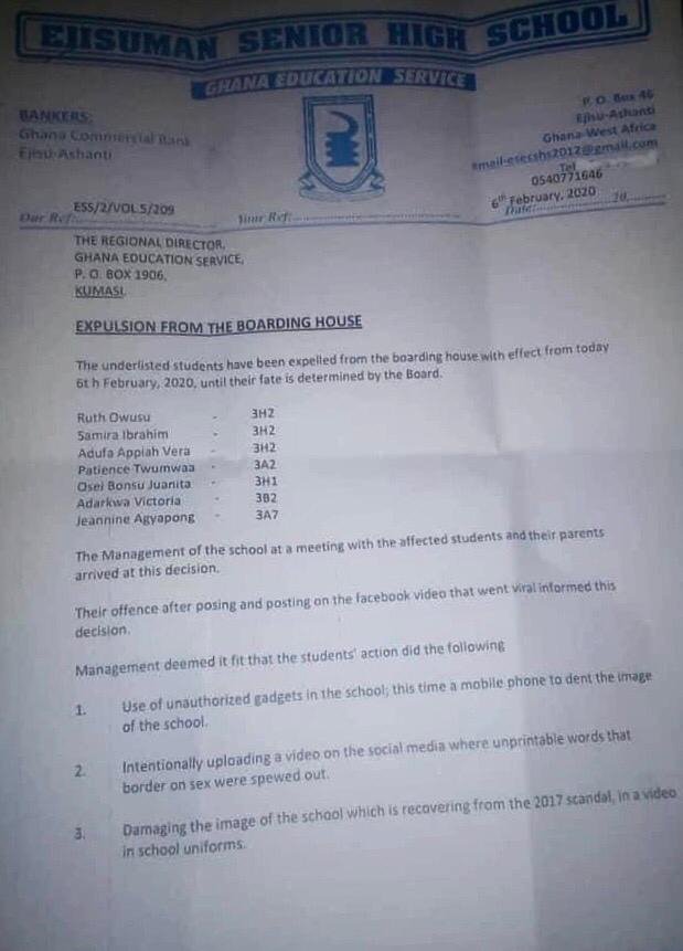 They were sacked from the boarding house effective February 6, 2020, pending a final determination of their fate by the school’s Board, a letter to the Ashanti Regional Director of Education said.