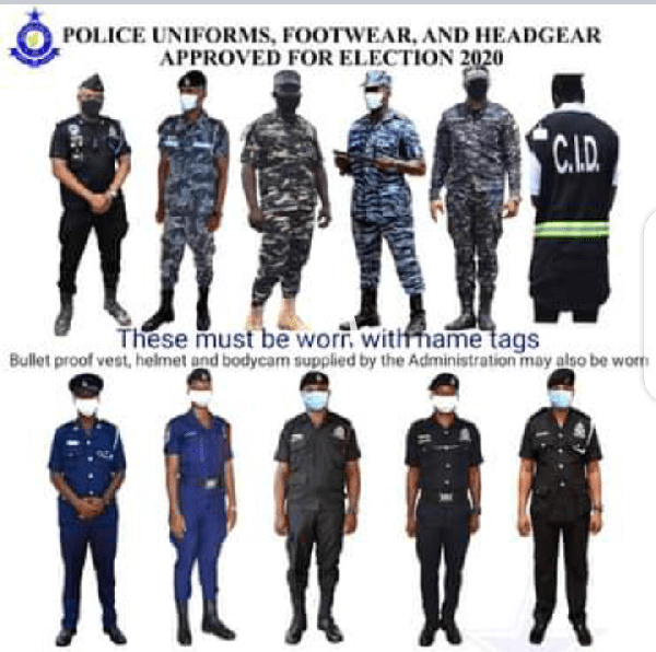 “In view of public enquiries on the police uniforms to be used for this year’s Presidential and Parliamentary Elections, the Inspector-General of Police Mr James Oppong-Boanuh has directed that all Police Officers wear the traditional police uniforms which are in the colours of blue-black, black and police camouflage; be it office or operational wear with the appropriate headgear for police duties. Plain clothed officers of the Criminal Investigations and Police Intelligence Departments (CID and PID) will, however, wear their approved overt and covert uniforms with their ID cards readily available for identification.