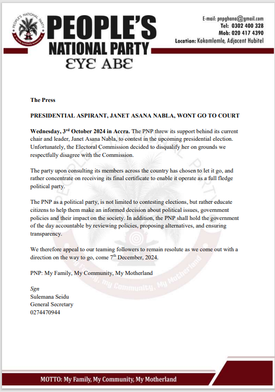 The People’s National Party (PNP) has announced that its presidential candidate, Janet Asana Nabla, will not contest her disqualification from the upcoming December presidential election in court.