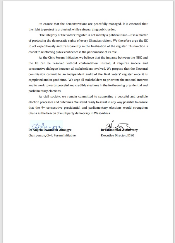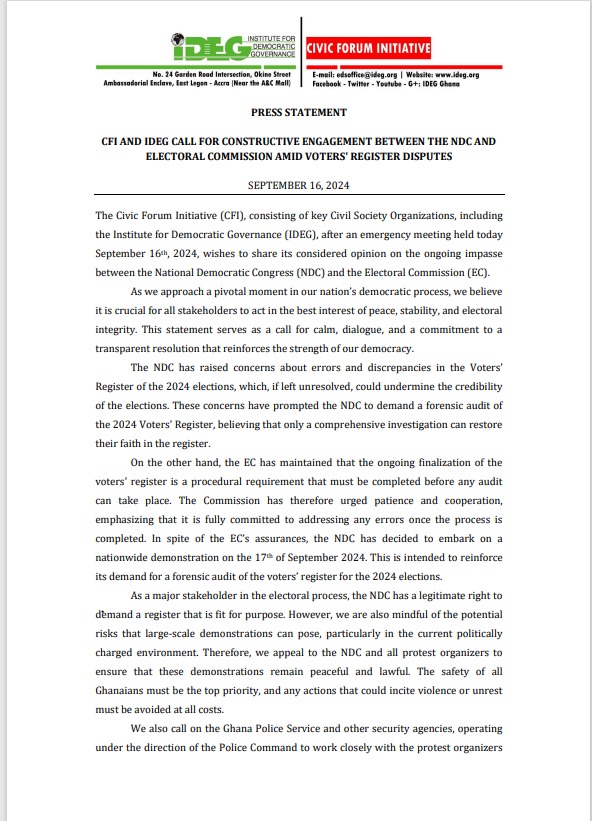 The Civic Forum Initiative (CFI), composed of key Civil Society Organisations, including the Institute for Democratic Governance (IDEG), has urged the National Democratic Congress (NDC) and the police to ensure that the NDC’s planned demonstration against the Electoral Commission (EC) over the voters’ register is both peaceful and lawful.