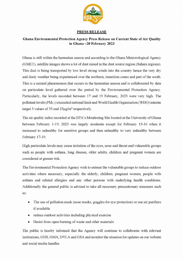 The EPA in a statement asked the public to minimise outdoor activities to prevent health risks associated with the current dry season which contains highly polluted dust.