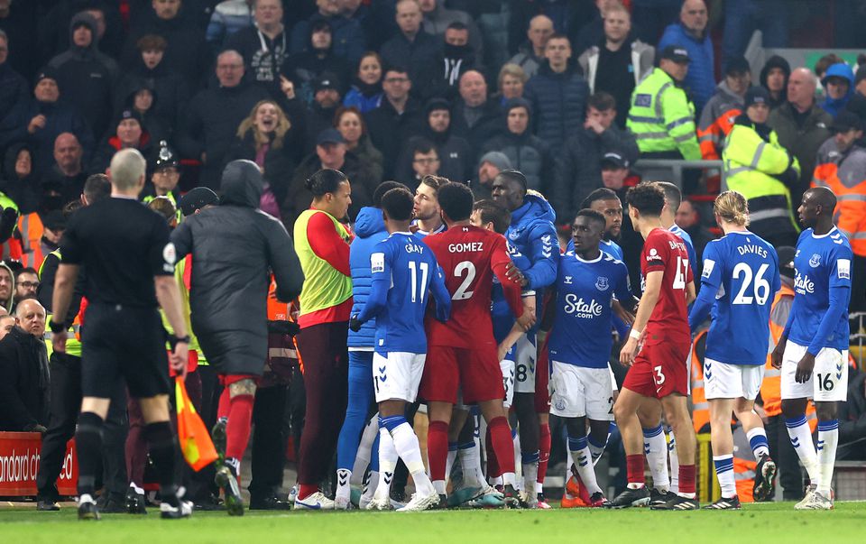 Everton goalkeeper Jordan Pickford and Liverpool defender Andy Robertson were both booked after a clash near the touchline before the incident escalated, with a number of players and substitutes from both teams getting involved.