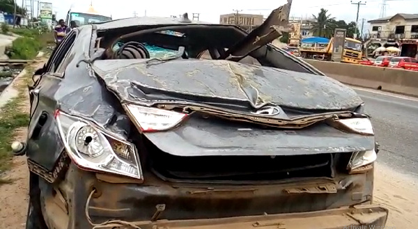According to information reaching Angelonline.com.gh, the incident occurred on the Kasoa flyover, when the driver of an unregistered Hyundai saloon car lost control leading to their somersault and falling to the ground.