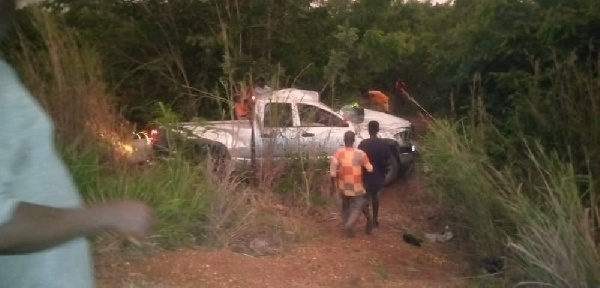 A visit by the GNA to the accident scene saw the pick-up in the bush with the number plates removed suggesting it might have somersaulted several times.