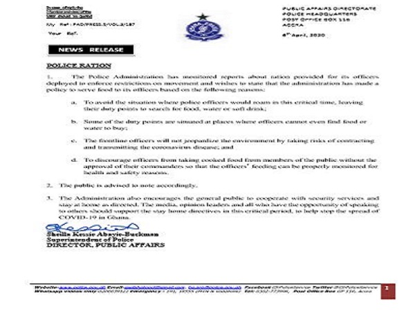“To discourage officers from taking cooked food from members of the public without the approval of their commanders so that the officers’ feeding can be properly monitored for health and safety reasons,” the Director of Public Affairs, Superintendent Sheilla Kessie Abayie-Buckman said in a statement to Ghana.