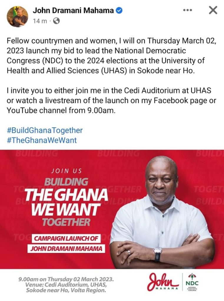 Former President John Dramani Mahama will on Thursday, March 2, 2023, launch his campaign in his bid to lead the National Democratic Congress (NDC) as its flagbearer for the 2024 general elections.