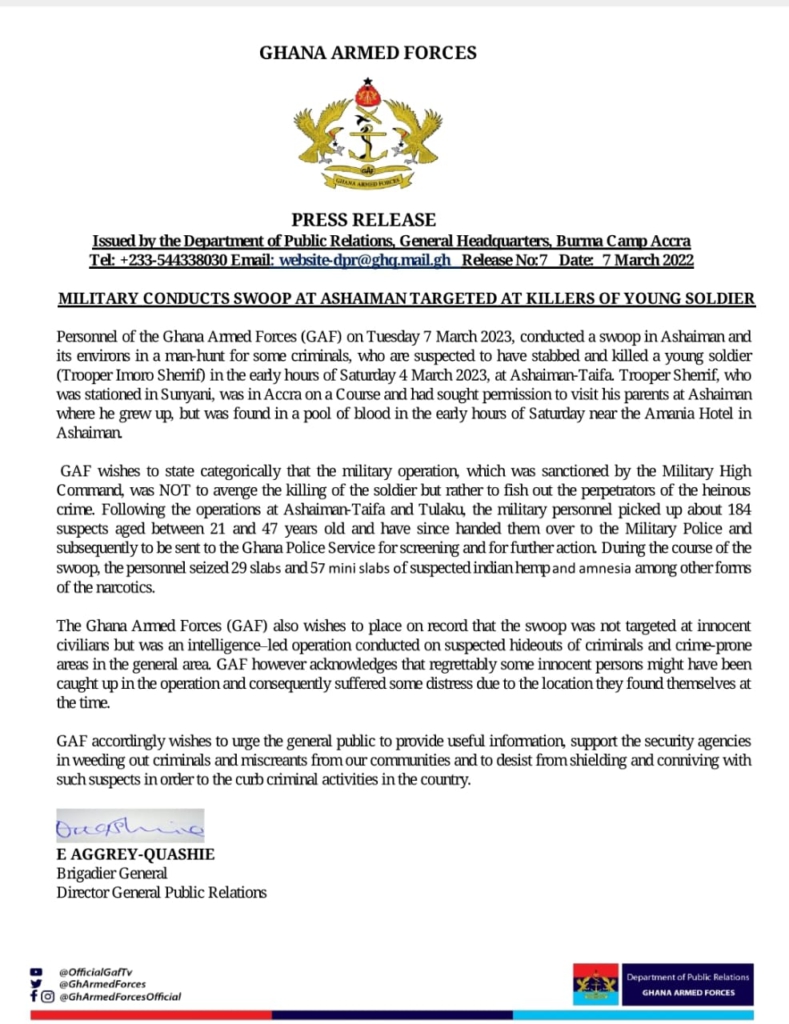 “The Ghana Armed Forces (GAF) also wishes to place on record that the swoop was not targeted at innocent civilians but was an intelligence–led operation conducted on suspected hideouts of criminals and crime-prone areas in the general area,” they stressed.