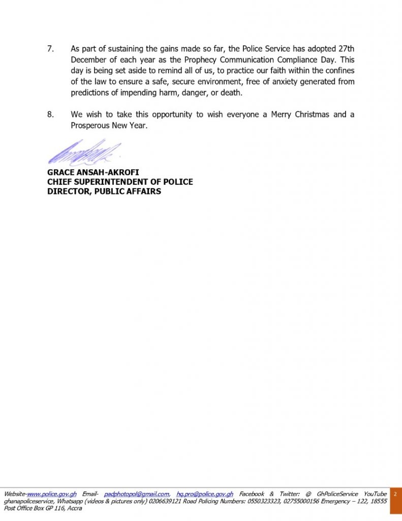 The Ghana Police Service has asked “faith-based groups to ensure continuous compliance with the law” relating “to the communication of prophecies”.