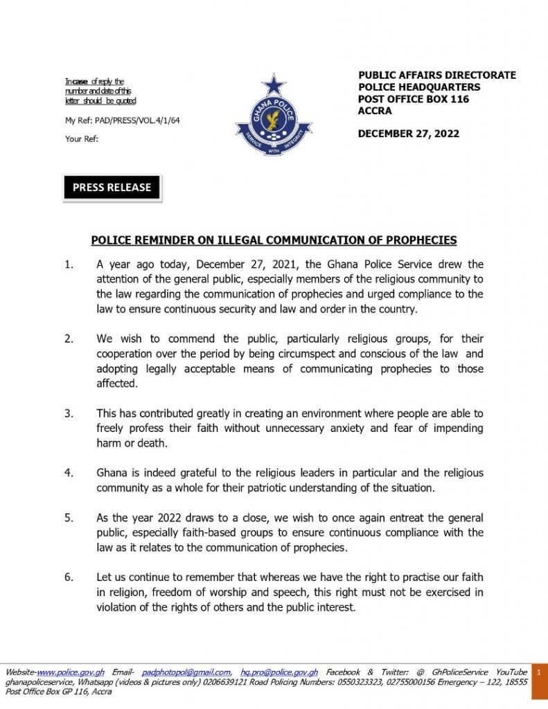 A year ago today, December 27, 2021, the Ghana Police Service drew the attention of the general public, especially members of the religious community to the law regarding the communication of prophecies and urged compliance to the law to ensure continuous security and law and order in the country.