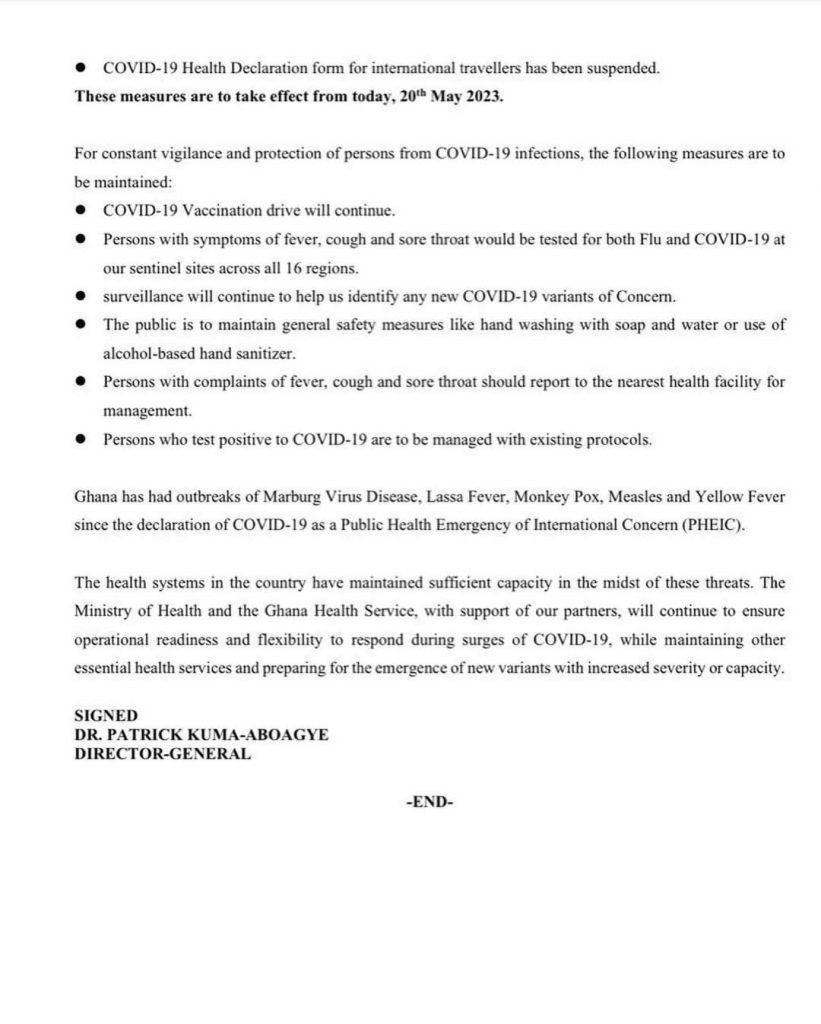 GHS further noted, “Based on the global and national situation, at the last national COVID-19 Task Force meeting on May 17, 2023, the following decisions were taken: Pre-departure testing and test at all Points of Entry are no more a requirement for all passengers. COVID-19 Health Declaration form for international travellers has been suspended. These measures are to take effect from today, 20. May 2023”.