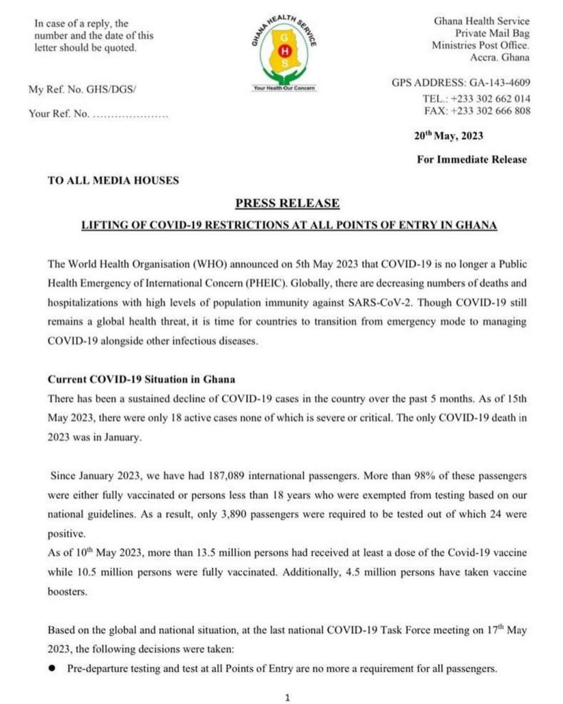 The GHS in its statement amongst others said, pre-departure testing and test at all points of entry are no more a requirement for all passengers, COVID-19 health declaration form for international travellers has been suspended.