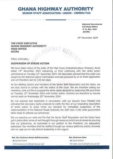 In a letter signed by Emmanuel Asina, Vice National Chairman of the GHA Senior Staff Association, and Boble Yasroku, National Chairman of the GHA Workers Union (CBMWU-TUC), the association explained that suspending the strike is in line with their duty as law-abiding citizens.