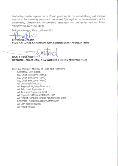 The association also stated that lawful protocols have been initiated to notify the NLC of their intention to resume the strike if necessary, particularly to press for the suspension of the implementation of the National Roads Authority Act 2024 (Act 1118).