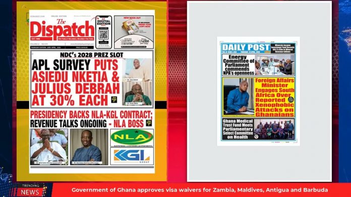NewsGhana Newspaper Ghana Newspaper Headlines: April 23, 2026; Sakumono Ramsar Site faces renewed encroachment 23rd April 2026 0 3 Share Facebook Twitter WhatsApp Linkedin Pinterest Telegram Viber Blame FWSC for salary adjustments delays Adamus mines tension claims false Businessman seeks help to reclaim factory and MORE…