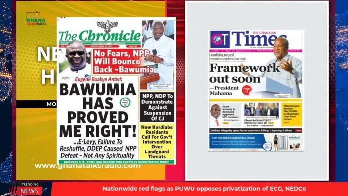 NewsGhana Newspaper Ghana Newspaper Headlines: April 28, 2025; E-levy, haircut, cathedral contributed to our defeat – Bawumia 28th April 2025 0 174 Share Facebook Twitter WhatsApp Linkedin Pinterest Telegram Viber Bawku conflict is National wound; let’s treat it with urgency – UEW Chancellor Bawumia salutes NPP polling station executives and footsoldiers Localizing natural resources exploration management: Framework out soon- President Mahama and MORE…
