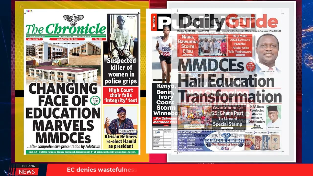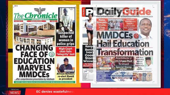 NewsGhana Newspaper Ghana Newspaper Headlines: April 29, 2024; Ghana Post Honours Otumfuo 29th April 2024 0 107 Share Facebook Twitter WhatsApp Linkedin Pinterest Telegram Viber -Freedom Of Speech Abuse Worrying – Panelists -MMDCEs Hail Education Transformation -Bawumia Kicks Off 2024 Campaign -Ghana Post Honours Otumfuo and MORE…