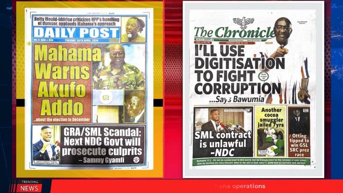 NewsGhana Newspaper Ghana Newspaper Headlines: April 30, 2024; Court Shoots Down NDC 30th April 2024 0 134 Share Facebook Twitter WhatsApp Linkedin Pinterest Telegram Viber -I’ll Use Digitization To Fight Corruption – Bawumia -Mahama Warns Akufo Addo About The Election In December -Bawumia Starts Campaign For Prez Elections In Eastern Region -Court Shoots Down NDC and MORE…