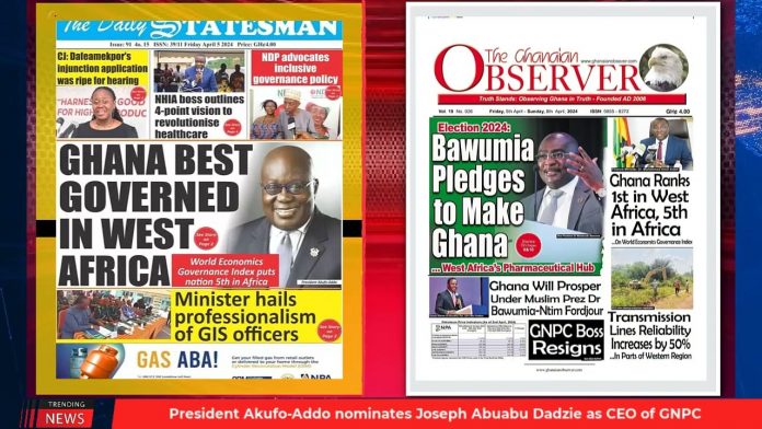NewsGhana Newspaper Ghana Newspaper Headlines: April 5, 2024; Mahama Hails Free SHS 5th April 2024 0 129 Share Facebook Twitter WhatsApp Linkedin Pinterest Telegram Viber -Alan Cash, Sakara Form Electoral Alliance -Don’t Overrun Budgets For Projects -Ghana Best Governed In West Africa -Mahama Hails Free SHS and MORE…