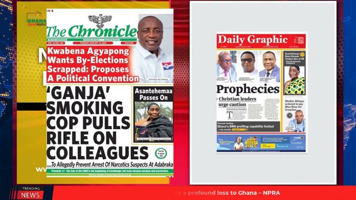 NewsGhana Newspaper Ghana Newspaper Headlines: August 12, 2025; Helicopter Crashed After 3 Attempts To Land – Kumasi Mayor 12th August 2025 0 68 Share Facebook Twitter WhatsApp Linkedin Pinterest Telegram Viber Prophecies: Christian Leaders Urge Caution ‘Ganga’ Smoking Cop Pulls Rifle On Colleagues… Asantehemaa Passes On At Age 98 and MORE…