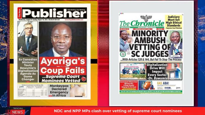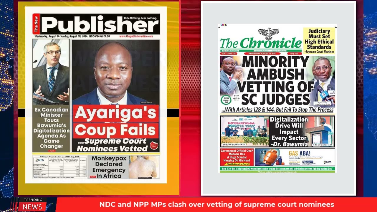 NewsGhana Newspaper Ghana Newspaper Headlines: August 14, 2024; Ayariga’s Coup Fails – Supreme Court Nominees Vetted 14th August 2024 0 68 Share Facebook Twitter WhatsApp Linkedin Pinterest Telegram Viber -How Awuku’s Leadership Is Transforming NLA -Chaos Rocks Supreme Court Judges Vetting -Wages, Jobs To Increase and MORE…