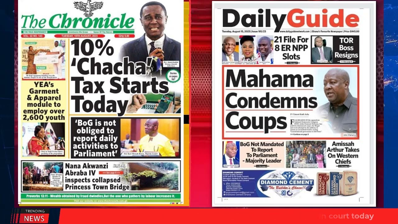 NewsGhana Newspaper Ghana Newspaper Headlines| August 15 | 2023; Mahama Condemns Coup 15th August 2023 0 340 Share Facebook Twitter WhatsApp Linkedin Pinterest Telegram Viber -Ghana Targets $6bn Over Next 4 years -Mahama Condemns Coup -Over 200 Killed In Bawku Conflict -10% ‘Chacha’ Tax Starts Today and MORE…