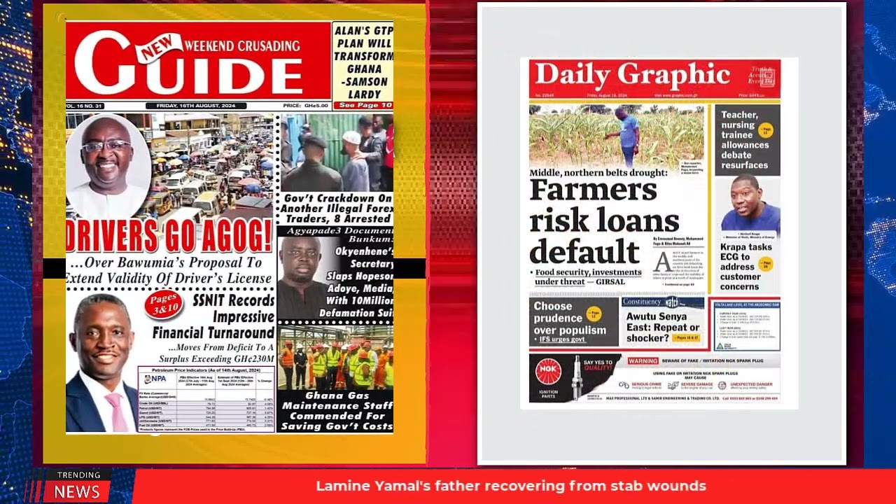 NewsGhana Newspaper Ghana Newspaper Headlines: August 16, 2024; Farmers Risk Loans Default 16th August 2024 0 95 Share Facebook Twitter WhatsApp Linkedin Pinterest Telegram Viber -Fast Track Resolution Of Customer’s Concern -SSNIT’S Dramatic Turnover Shocks PAC -Drivers Go Agog Over Bawumia’s Proposal To Extend Validity Of Drivers License and MORE…