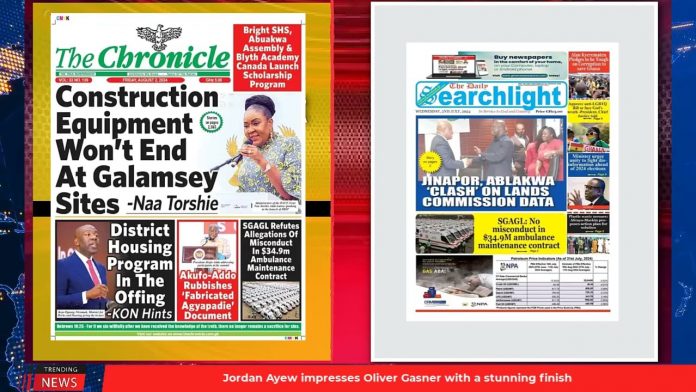 NewsGhana Newspaper Ghana Newspaper Headlines: August 2, 2024; Mahama Reports Akufo-Addo 2nd August 2024 0 106 Share Facebook Twitter WhatsApp Linkedin Pinterest Telegram Viber -Scrap 5% VAT On Real Estate Industry -Construction Equipment Won’t End At Galamsey Sites – Naa Torshie -Ambulance Dealers Rubbish Ablakwa Claims and MORE…