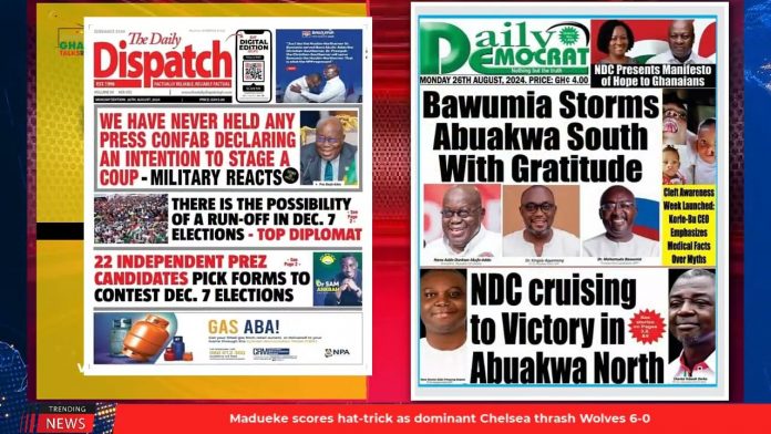 NewsGhana Newspaper Ghana Newspaper Headlines: August 26, 2024; Ghana Needs Upgrade Not Reset – Bawumia 26th August 2024 0 101 Share Facebook Twitter WhatsApp Linkedin Pinterest Telegram Viber -GAF Shuns Coup Claims Ahead of 2024 Elections -Bawumia Storms Abuakwa South With Gratitude -We Have Never Held Any Press Confab Declaring An Intention To Stage A Coup; Military Reacts and MORE…