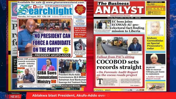 NewsGhana Newspaper Ghana Newspaper Headlines| August 3 | 2023; Testament Of Banking Leadership 3rd August 2023 0 281 Share Facebook Twitter WhatsApp Linkedin Pinterest Telegram Viber -I’ve No Candidate In NPP Prez Primary -Testament Of Banking Leadership -BOG Sets Record Straight -Pay Us Reparation For Atrocities and MORE…