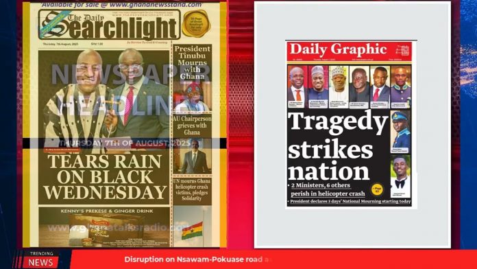 NewsGhana Newspaper Ghana Newspaper Headlines: August 7, 2025; Tears Rain On Black Wednesday 7th August 2025 0 58 Share Facebook Twitter WhatsApp Linkedin Pinterest Telegram Viber Drama In Ada: DCEs Beg Chiefs In Public Tragedy Strikes Nation President Mahama Suspends Activities, Declares 3-Day Mourning After Helicopter Crash and MORE…
