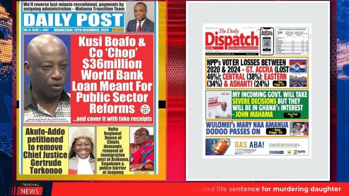 NewsGhana Newspaper Ghana Newspaper Headlines: Dec. 18, 2024; Nana outdoors new foreign affairs complex 18th December 2024 0 68 Share Facebook Twitter WhatsApp Linkedin Pinterest Telegram Viber We can’t pay workers whose mini budget is not approved Finance Minister declares: We are handing over a strong economy 10,233 fibre cuts , theft cost telcos $17.4m , A major strain on resources of operators and MORE…