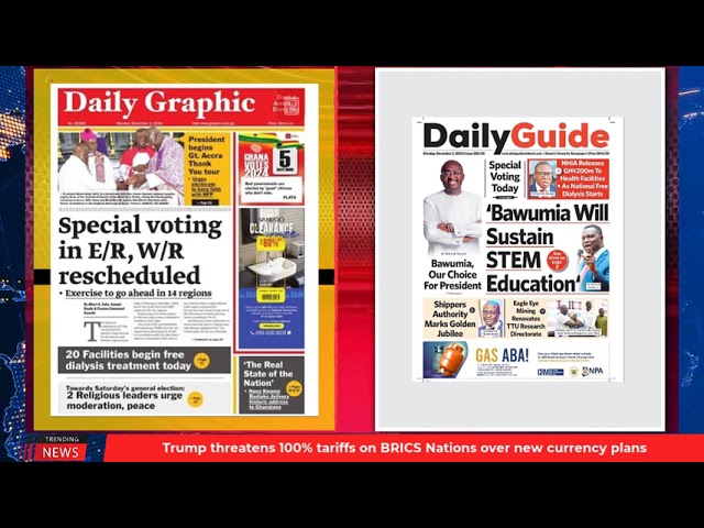 NewsGhana Newspaper Ghana Newspaper Headlines: Dec. 2, 2024; Dec. 7th Elections: Consider competence over religion 2nd December 2024 0 55 Share Facebook Twitter WhatsApp Linkedin Pinterest Telegram Viber Special voting in E/R, W/R rescheduled, exercise to go ahead in 14 regions Bawumia will sustain STEM education Ablakwa disgraced in Ashanti Region and MORE…