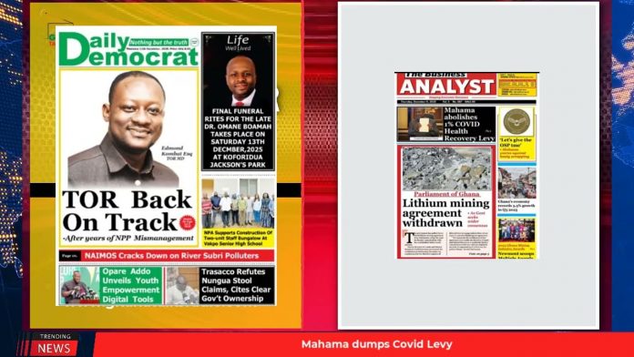 NewsGhana Newspaper Ghana Newspaper Headlines: December 11, 2025; Gov’t withdraws 5% Lithium deal 11th December 2025 0 23 Share Facebook Twitter WhatsApp Linkedin Pinterest Telegram Viber GoldBod helps BoG mobilise $10bn TOR back on track Calls to scrap OSP premature and MORE…