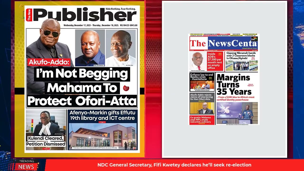 NewsGhana Newspaper Ghana Newspaper Headlines: December 17, 2025; Akufo-Addo: I’m Not Begging Mahama To Protect Ofori-Atta 17th December 2025 0 2 Share Facebook Twitter WhatsApp Linkedin Pinterest Telegram Viber I’ll win hands down. – Bryan Otumfuo settles Bawku dispute I’ll heal NPP divisions. – Bryan Acheampong and MORE…