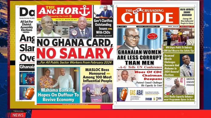 NewsGhana Newspaper Ghana Newspaper Headlines | December 19 | 2023; No Ghana Card, No Salary 19th December 2023 0 295 Share Facebook Twitter WhatsApp Linkedin Pinterest Telegram Viber -Angry Bagbin Slams Nana Over 3 Bills -Go Out, Cast Your Vote -Ghanaian Women Are Less Corrupt Than Men -No Ghana Card, No Salary and MORE…